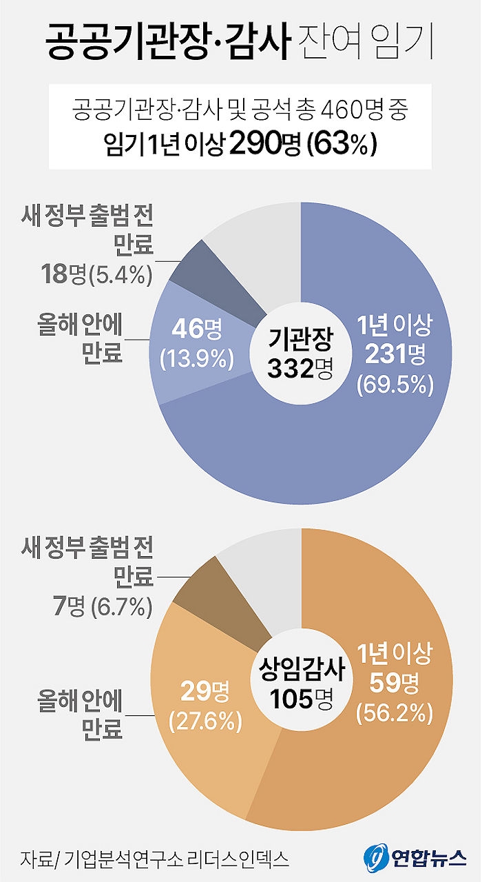이들 기관장과 감사를 포함한 437명에 현재 공석 중인 23명 자리를 포함해 총 460명 가운데 63%인 290명의 임기가 1년 이상 남았다. 45%인 207명의 임기는 2년이나 남았다.