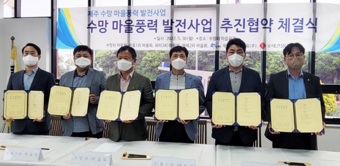 이미지 확대보기9일 롯데건설은 지난달 30일 제주 서귀포시 남원읍 수망리 마을회관에서 마을회(수망리·신흥1리·위미3리·하례2리), 제이원윈드파워와 '제주 수망 마을풍력 발전사업 추진 협약'을 체결했다고 밝혔다.
