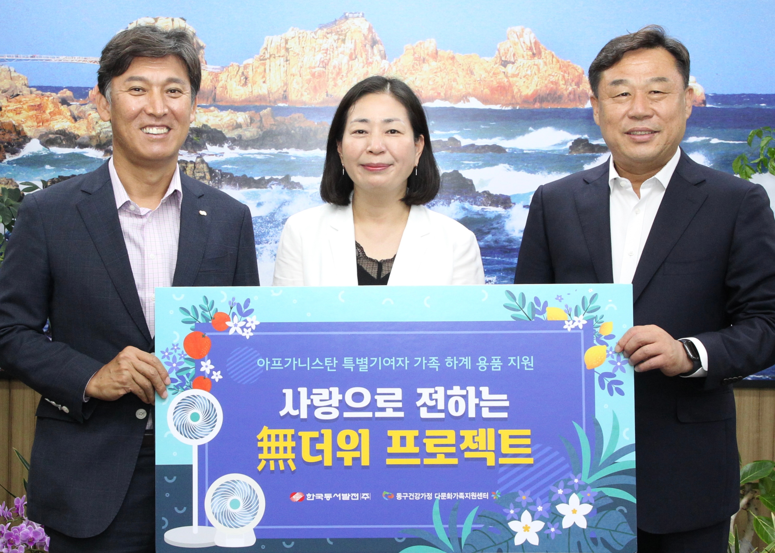 이미지 확대보기5일 동서발전은 울산 동구청장실에서 '사랑으로 전하는 無더위 프로젝트' 지원금을 전달했다고 밝혔다. 전달식에는 김영문 동서발전 사장·김종훈 울산 동구청장·이정숙 다문화가족지원센터장 등이 참석했다.