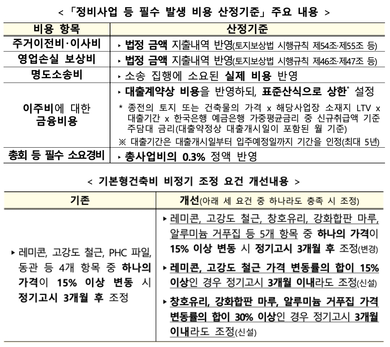 먼저 '공동주택 분양가격의 산정 등에 관한 규칙'을 개정해 공공택지 외의 택지에 적용되는 택지 가산비에 정비사업 등 추진과정에서 필수적으로 발생하는 △주거이전비 △이사비 △영업 손실보상비 △명도소송비 △이주비 금융비용 등 필수 소요 경비를 추가했다. 국토부 고시인 '정비사업 등 필수 발생 비용 산정기준'을 제정해 구체적인 비용 산정 기준을 정했다.