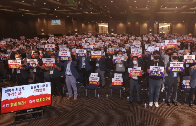 중소 레미콘업체 대표 700여명은 지난달 25일 서울 여의도 중소기업중앙회에서 규탄대회를 열고 시멘트 가격 인상 철회를 촉구했다. 이들은 정부에 시멘트 업체들의 불공정 거래 사례 조사도 요구했다.