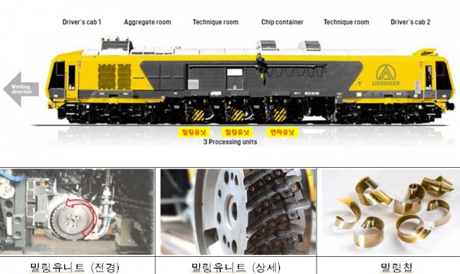 이미지 확대보기레일밀링차는 손상된 레일을 칩(Chip) 형태로 자르거나 연마하는 작업 차량이다. 철도공단은 선로 유지보수 작업의 고도화를 위해 도입을 추진 중이다.