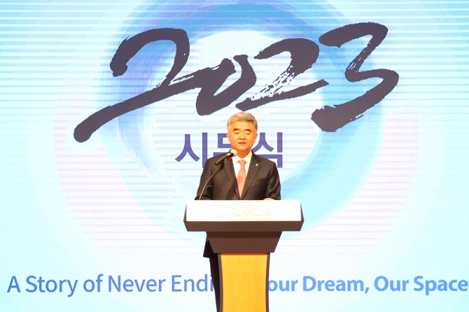이미지 확대보기3일 대우건설은 을지로 트윈타워에서 2023년 시무식을 개최했다. 시무식에는 정원주 중흥그룹 부회장과 백정완 사장을 비롯해 주요 경영진과 임직원 등 250여명이 참석했다.