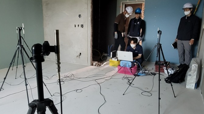 주택에서 관계자들이 바닥 충격음 성능검사를 하는 모습. 사진=국토안전관리원