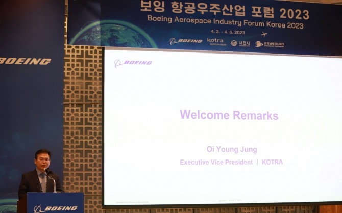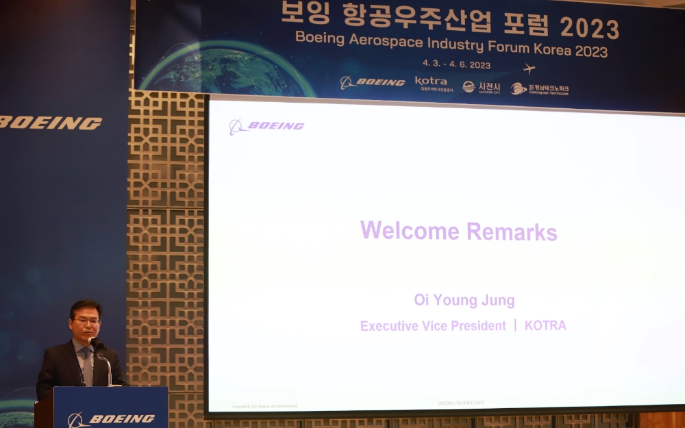 이미지 확대보기KOTRA는 3일부터 나흘간 부산 파크하얏트호텔에서 미국 보잉사, 경남 사천시, 경남테크노파크와 함께 ‘보잉 항공우주산업 포럼 2023’을 개최한다고 밝혔다.