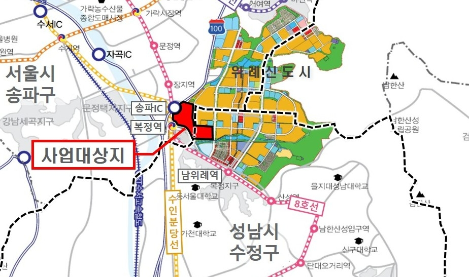 이미지 확대보기위례신도시 복정역세권은 22만㎡ 규모의 복합용지, 도시지원시설용지 총 3필지다. 지하철 8호선·분당선 환승역 복정역에 연접해 우수한 입지로 평가받고 있다.