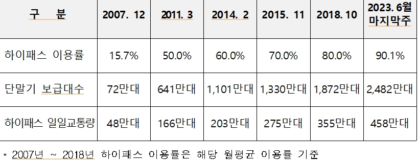 단말기 보급 증가와 함께 하이패스 일일교통량도 급증했다. 하이패스 보급 첫해인 12월, 하이패스 일일교통량은 48만대를 기록한 후 2023년 6월에는 458만대로 10배 가까이 증가한 것으로 나타났다.