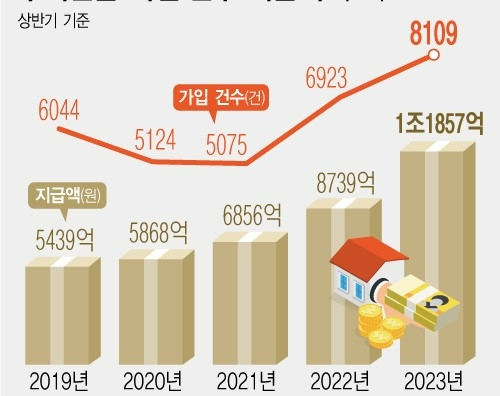 주택연금 가입자 급증에 상반기 연금 지급액은 1조1857억원으로 지난해 같은 기간 8739억원 보다 35.7% 증가했다. 상반기 기준 주택연금 지급액이 1조원을 넘은 것도 올해가 처음이다.