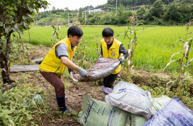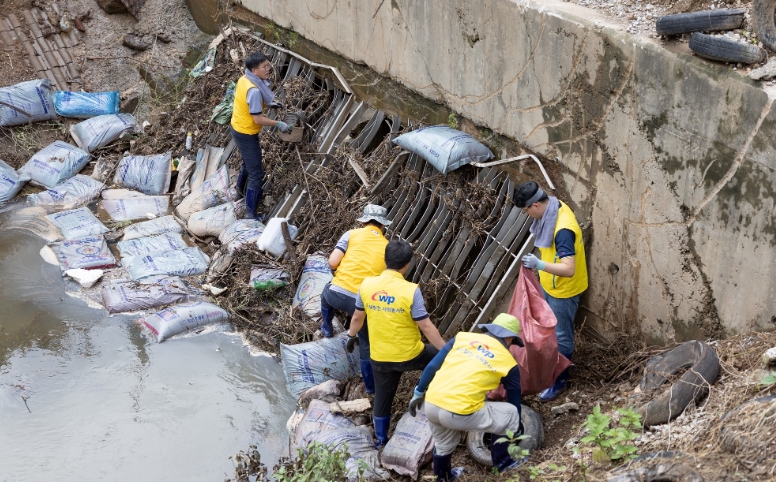 서부발전 직원들은 집중호우로 무너진 산비탈을 복구하고 유실된 가축 사료 포대를 수거했다. 또 하천 범람으로 발생한 흐트러진 생활 쓰레기를 수거했다.