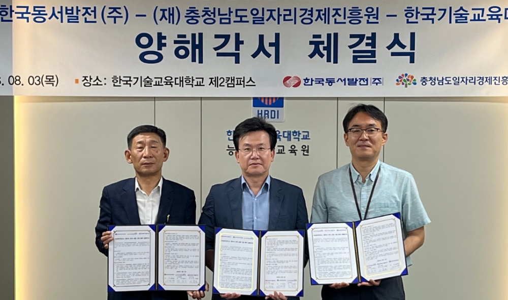 이미지 확대보기한국동서발전은 3일 충남 천안시 한국기술교육대학교에서 석탄발전소 상주 협력사 근로자의 일자리 전환을 위해 충남 일자리경제진흥원, 한국기술교육대학교와 ‘협력사 업의 전환 지원’ 공동협약을 체결했다고 밝혔다.