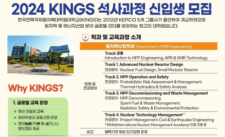 KINGS는 2012년 한국전력공사(KEPCO) 5개 그룹사가 출연해 개교했다. 원자력 및 에너지산업 분야 글로벌 리더를 양성하는 대학원이다.
