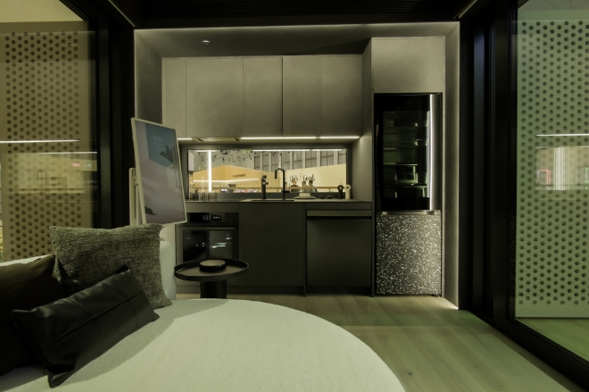 이번 유럽형 스미트코티지에는 국내 모듈러 자회사인 자이가이스트가 선보인 공간 창출과 구성 능력을 활용해 10평 남짓의 소형주택이지만 충분한 공간감을 확보했다. 여기에 LG전자의 사물인터넷(IoT)으로 제어되는 오브제컬렉션이 더해져 공간의 가치를 극대화했다.