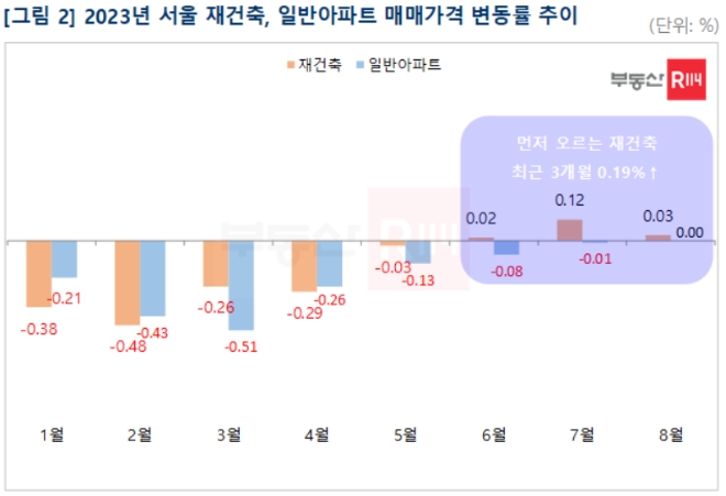 재건축 아파트 가격은 지난 6월 0.02% 오르며 상승 전환했다. 7월에는 0.12% 상승했다. 일반 아파트값은 지난 7월 전월 대비 0.01% 하락했고 8월에는 보합세를 유지했다. 재건축 아파트가 일반 아파트보다 빠르게 상승 전환했다.