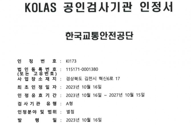 권용복 공단 이사장은 “KOLAS 공인검사기관 인정 획득을 통해 검사결과의 신뢰성을 한층 더 강화 할 수 있는 기반을 마련했다”며, “앞으로 철도형식승인 공인검사기관으로서 철저한 검사를 통해 안전한 철도운행 환경 확보를 위해 노력할 것”이라고 밝혔다.
