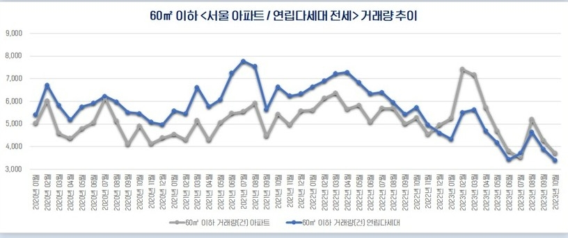 2020년 1월부터 2022년 11월까지 전용 60㎡ 이하 빌라의 평균 전세 거래량은 6131건으로 전체 거래 비중의 54%를 차지했다. 반면, 같은 기간 전용 60㎡ 이하 아파트 평균 전세 거래량은 5155건으로 45.7%의 거래 비중을 보였다.