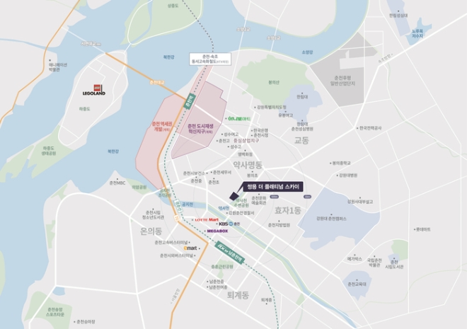 쾌적한 주거환경도 누릴 수 있다. 단지 남서쪽으로 공지천과 합류되는 약사천이 흐르고 있어 쾌적한 주거여건을 지닌 데다 조망권(일부가구)도 확보될 것으로 보인다. 단지 앞에 약사천 수변공원이 조성돼 있고 공지천 공원도 가까워 산책 및 여가, 운동 등을 즐길 수 있다. 특히 춘천의 대표 테마파크인 '레고랜드 코리아'도 차량으로 10분 대에 닿는다.