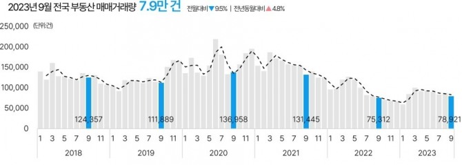 17일 부동산 전문기업 ‘부동산플래닛’이 국토교통부 실거래가 자료(이달 1일 기준)를 분석한 ‘2023년 9월 전국 부동산 유형별 매매거래 특성’ 자료에 따르면 지난 9월 전국의 부동산 거래량은 7만8921건을 기록하며 8월 8만7192건에 비해 9.5% 감소한 것으로 나타났다.