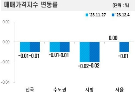 이미지 확대보기7일 한국부동산원의 12월 첫째 주(4일 기준) ‘전국 주간 아파트가격 동향’ 조사 결과에 따르면 전국 아파트값은 0.01% 하락해 전주와 같은 하락 폭을 나타냈다. 수도권과 지방도 0.01%, 0.02%가 각각 하락했다. 전주 보합이던 서울은 0.01% 떨어져 하락 전환했다.