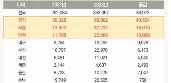 경기 4만534건 증가…전국 증가량의 45% 차지