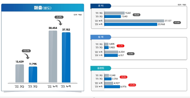 5일 업계에 따르면 DL이앤씨는 지난 2023년 3분기 연결기준으로 매출 1조8374억원, 영업이익 803억 원, 순이익 670억 원을 기록했다고 공시했다. 2022년 같은 기간보다 매출은 0.6%, 영업이익은 30.9%, 순이익은 58% 줄어들었다.