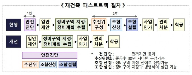 30년 넘은 아파트는 안전진단이란 재건축 첫 관문이 사라지고 주민들의 정비계획 입안 제안으로 바뀌는 '재건축 패스트트랙'이 도입됐다. 서울은 신속통합기획(신통기획)까지 적용하면 재건축 사업 기간이 최대 5~6년가량 단축될 전망이다.