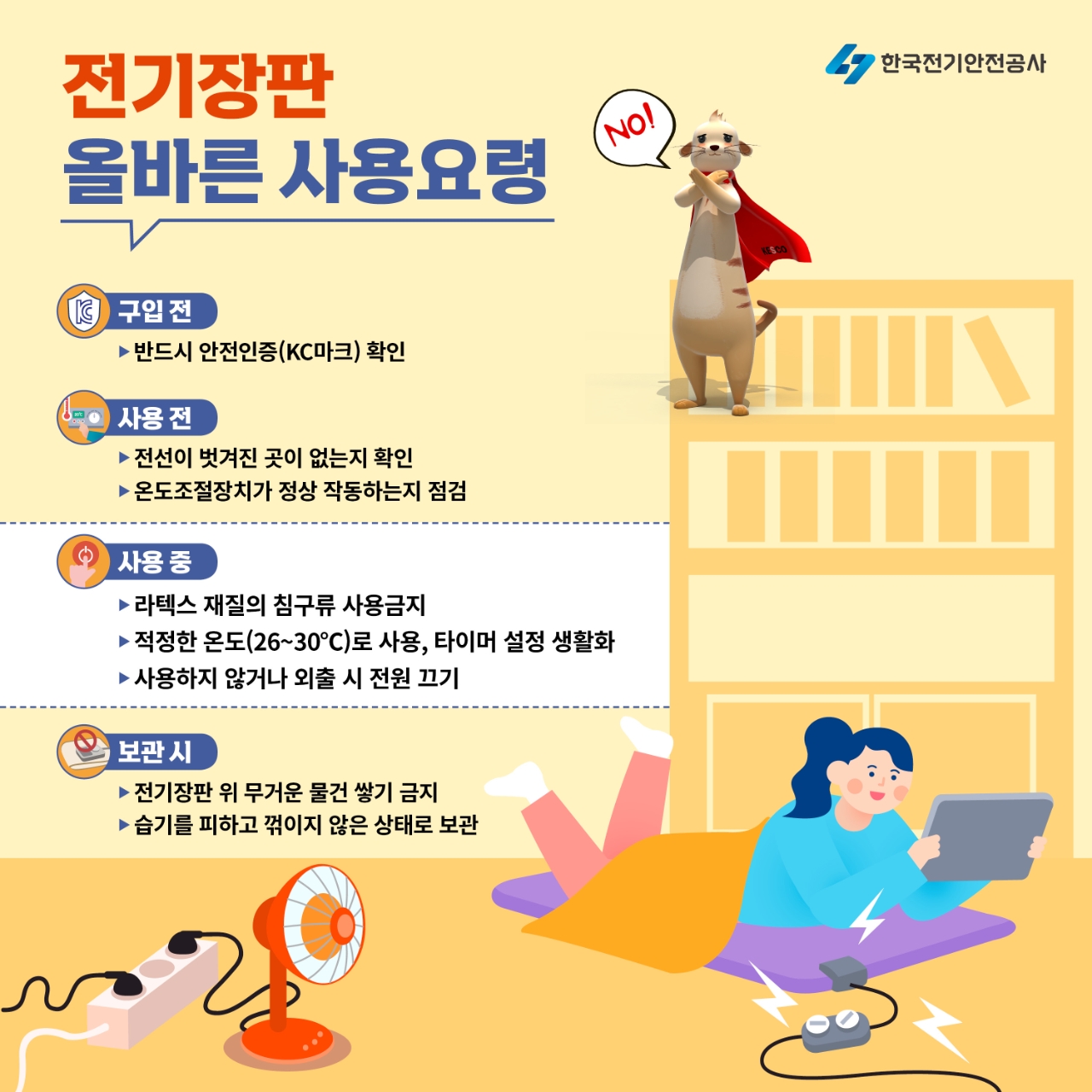 이외에도 전기안전공사는 전열기구를 구입할 때 반드시 안전인증(KC마크)을 확인하고, 사용 전 손상된 부분이나 전선의 파손 여부를 확인할 것을 당부했다. 또한, 전기장판 사용 시 온도조절기나 스위치의 이상이 발견되면 수리하거나 교체해야 한다고 강조했다.
