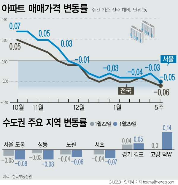 이미지 확대보기1일 한국부동산원의 1월 다섯째 주(1월29일 기준) '아파트값 동향 조사'에 따르면, 서울 아파트 매매가격은 0.05% 하락해 지난주(-0.03%)보다 하락 폭이 확대됐다. 서울 아파트값은 지난달 중순부터 9주 연속 하락을 이어갔다.
