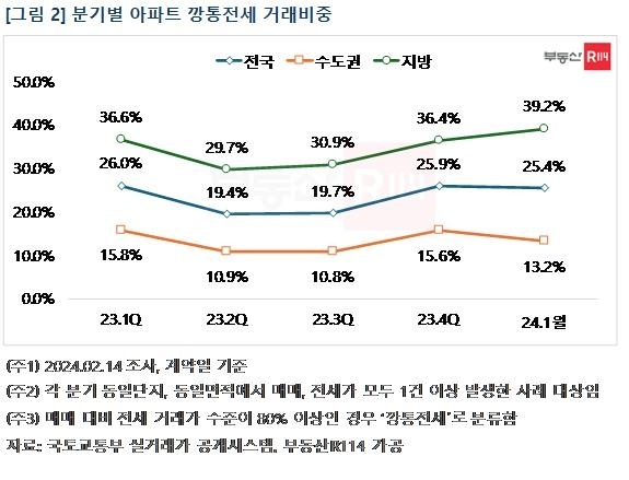 아파트는 비아파트에 비해 전세 대비 매매가격이 높아 깡통전세 위험이 낮은 것으로 인식되지만 지방 위주로 전세보증금이 매매가의 80% 이상인 거래비중이 늘고 있어 전세 임차인들의 주의가 요구된다.