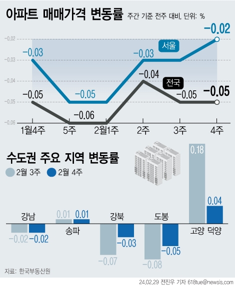 이미지 확대보기수도권(-0.04%→-0.04%)과 지방(-0.05%→-0.05%)은 모두 하락폭이 그대로 유지됐다. 서울은 지난주 -0.03%에서 이번 주 -0.02%로 하락폭이 축소됐다.