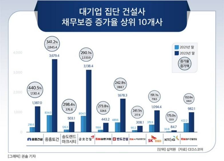 이어 태길종합건설(241.5%), SK디앤디(191.1%), KT&G(175.0%), 동아건설산업(132.6%), SM하이플러스(118.5%), 롯데건설(74.7%), 한화(69.8%), 현대건설(52.7%), 두산에너빌리티(45.7%), 태영건설(39.2%), GS건설(37.7%), SK에코플랜트(35.7%), 중봉건설(31.9%), 효성중공업(28.5%) 등의 순으로 채무보증 증가폭이 컸다.