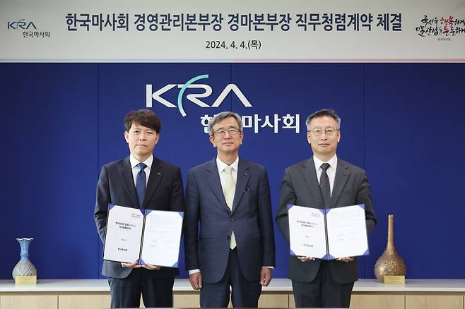 이미지 확대보기5일 업계에 따르면 한국마사회 추완호 경영관리본부장과 송대영 경마본부장이 지난 4일 정기환 회장과 직무청렴계약을 체결했다.