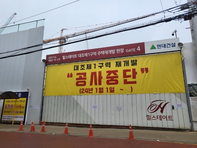 현대건설이 시공을 맡아 지난 2022년 10월 착공했으나 조합집행부 공백, 미수 공사비 1800억원 부담 문제로 지난 1월 1일부터 공사가 중단된 상태다.