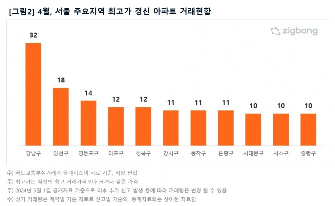 지역별로 3월 대비 4월 최고가 거래가 크게 증가한 지역은 △성북구(3월:4건->4월:12건, 300%), △중랑구 (3월6건->4월:10건, 167%), △영등포구(3월:10건->4월:14건, 140%), △노원구(3월:6건->4월:8건, 133%)순으로 나타났다.