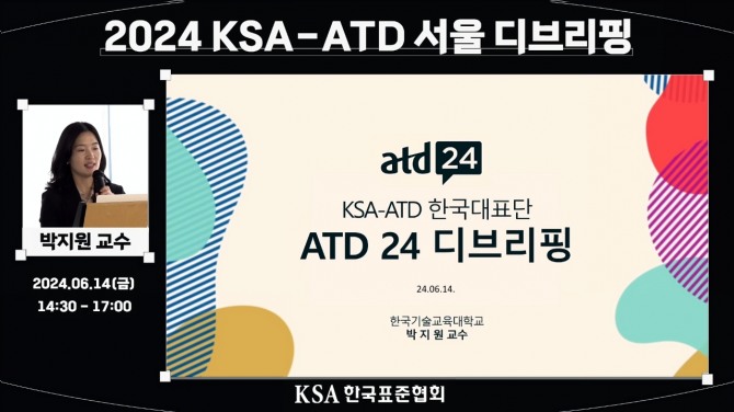 디브리핑을 진행한 한국기술교육대학교 박지원 교수는 기술변화에 따른 조직 변화관리, HRD 분야에서의 생성형 AI 활용법, 기술혁신 시대의 리더십 등 ATD 2024의 키워드를 소개하며 “기업의 생성형 AI 도입이 증가함에 따라 임직원의 디지털 리터러시 역량 강화는 필수적”이라고 강조했다.