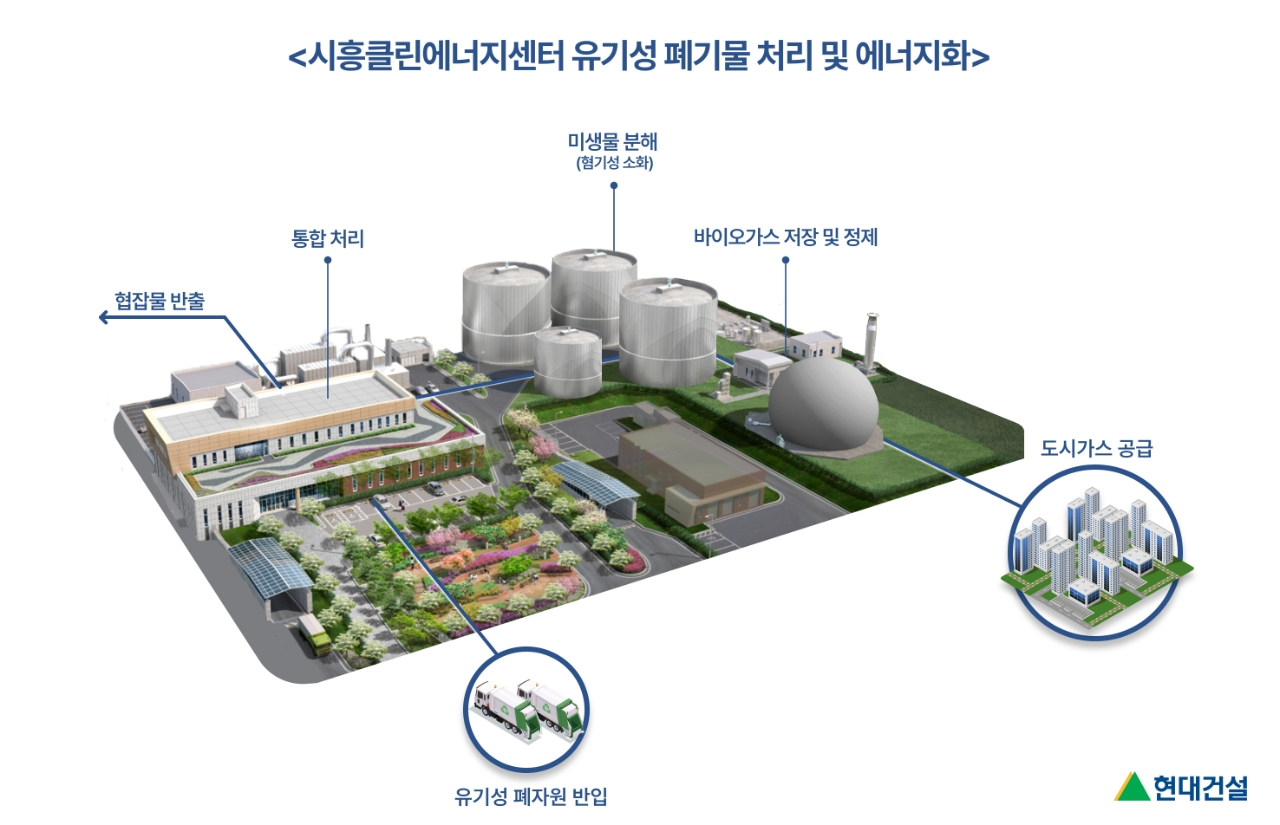 현대건설이 건설하고 운영 중인 충주 음식물 바이오 에너지센터는 음식물 쓰레기를 처리해 추출한 바이오가스를 원료로 수소를 생산해 인근 수소 융복합충전소에 공급하고 있다. 이외에도 현대건설은 ‘구미시 광역 통합 바이오가스화 시설 민간투자사업’과 ‘인제 통합 바이오가스에너지화 시설 국책과제’ 등을 수행하며 기술 안정성을 제고하는 한편 자원순환형 에너지화 사업의 경쟁력을 지속적으로 강화하고 있다.