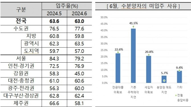 이미지 확대보기16일 주택산업연구원(이하 주산연)이 주택사업자를 대상으로 설문 조사한 결과 지난달 전국 입주율은 63.0%로 지난 5월과 비교해 0.6% 소폭 하락했다.