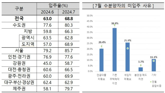 13일 주택산업연구원(이하 주산연)이 주택사업자를 대상으로 설문 조사한 결과 지난달 전국 입주율은 68.8%로 지난 5월과 비교해 5.8%포인트 상승했다.