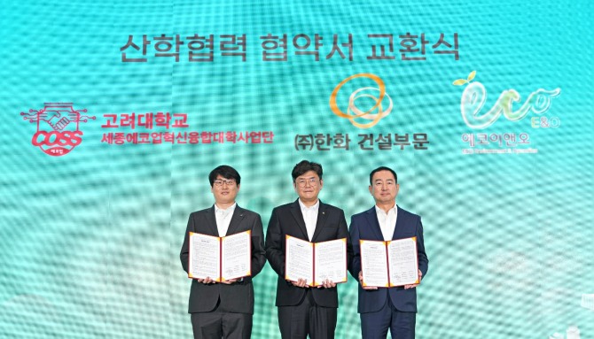 이미지 확대보기㈜한화 건설부문은 지난 25일 충청남도 정부세종컨벤션센터에서 열린 ‘2024 에코업 페어’에서 고려대학교 ‘세종 에코업 혁신융합대학 사업단’ 및 에코이앤오㈜와 산학협력 MOU(업무협약)를 체결했다고 26일 밝혔다.