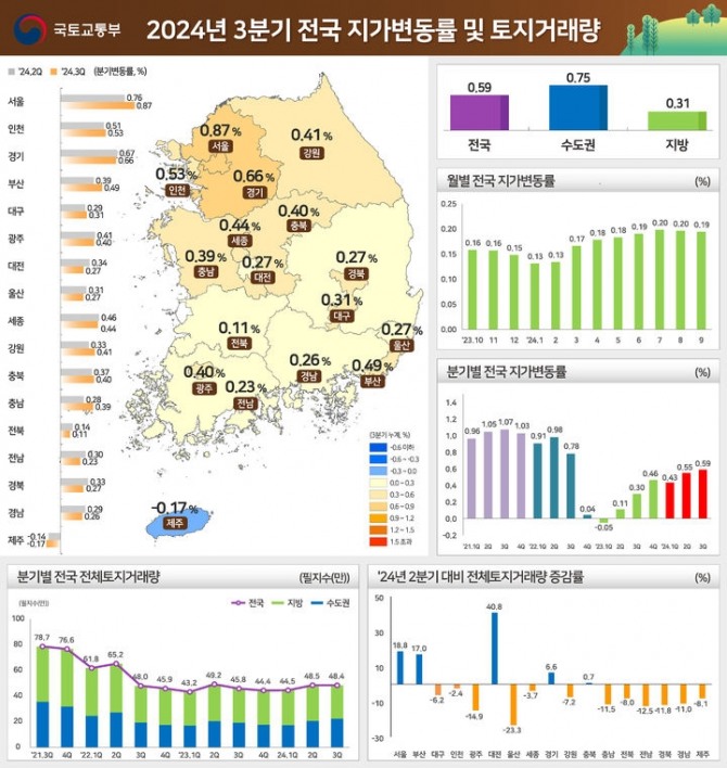 25일 업계에 따르면 국토교통부와 한국부동산원이 지난 24일 발표한 3분기 지가변동률과 토지거래량 자료를 살펴본 결과 올 3분기 전국 토지가격이 0.59% 상승했다.