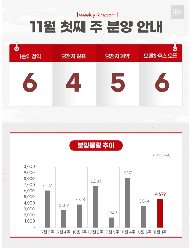 이미지 확대보기2일 부동산R114에 따르면 11월 첫째 주에는 전국 6개 단지 총 4679가구(일반분양 3172가구)가 공급 물량이다.