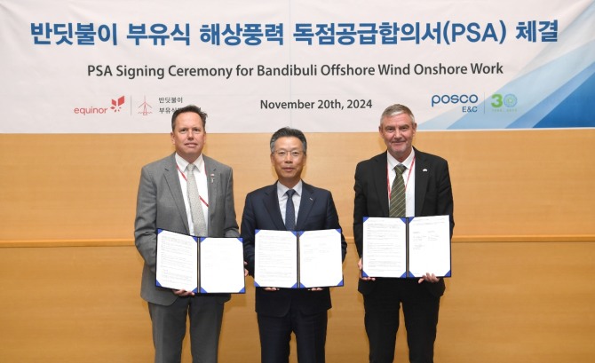 이미지 확대보기포스코이앤씨 지난 20일 인천 송도사옥에서 ‘반딧불이에너지’와 ‘울산 반딧불이’ 해상풍력 독점공급합의서(PSA: Preferred Supplier Agreement)를 체결했다고 25일 밝혔다.