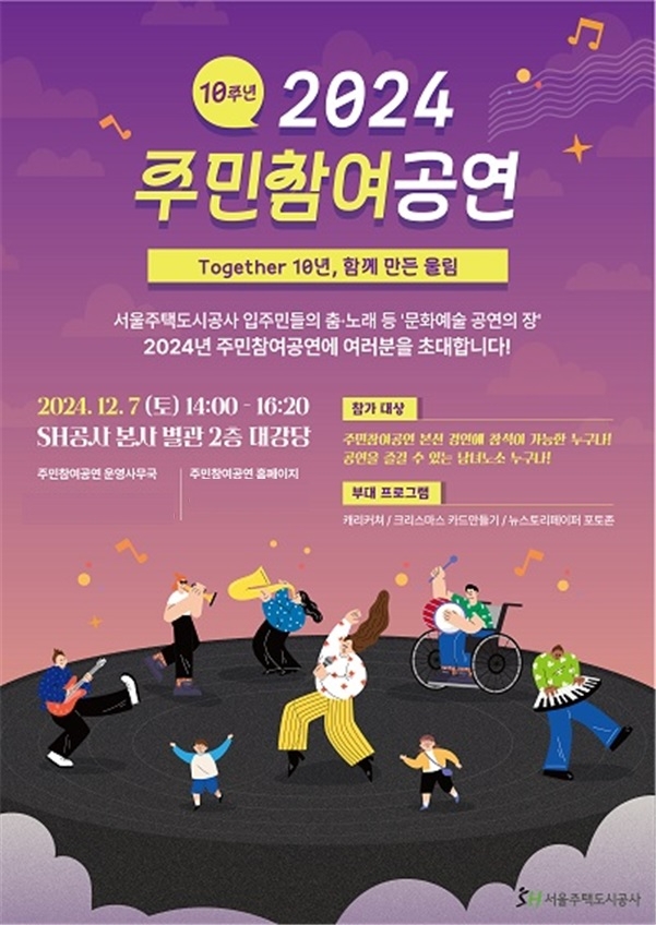 SH공사는 다음달 7일 강남구 본사 별관 2층 대강당에서 ‘2024년 주민참여공연’을 열고, 공연과 경품 이벤트 등을 즐길 참관객을 모신다고 29일 밝혔다.