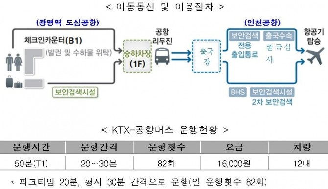 KTX-공항버스(노선번호 6770)는 광명역과 인천공항을 하루 82회 운행한다. 운임은 1만6000원이며, 모바일앱 ‘코레일톡’과 전국 역 창구에서 예매 가능하다.