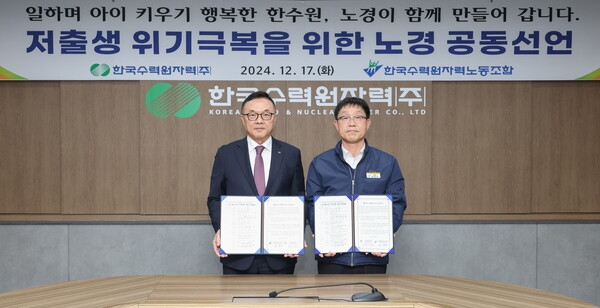 이미지 확대보기한국수력원자력과 노동조합이 지난 17일 서울 한수원 방사선보건원에서 ‘저출생 위기 극복을 위한 노경 공동선언식’을 개최했다.