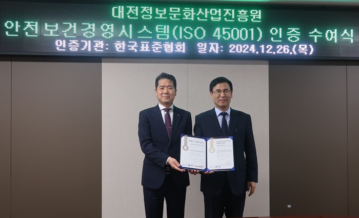 이미지 확대보기한국표준협회는 지난 26일 대전정보문화산업진흥원에 ISO45001(안전보건 경영시스템) 인증서를 수여했다고 31일 밝혔다.