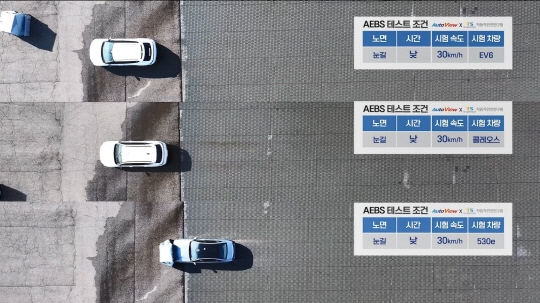 시험조건은 주행하는 차선으로 장애물 차량의 일부가 차선을 침범한 상황을 모사해 적응형순항장치가 작동하는지 여부이며, 시험 차량은 EV6(기아), 그랑 콜레오스(르노), 530e(BMW)이다.
