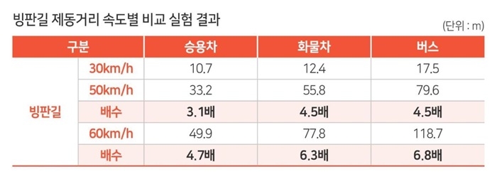또한, 같은 조건에서 화물차와 버스는 각각 4.6배(12.4m), 4.9배(17.5m) 더 미끄러지고 나서 정지했다.