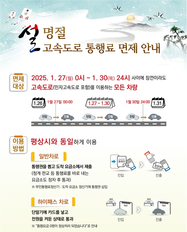 한국도로공사는 정부의 설 연휴 특별교통대책에 따라 오는 27일 0시부터 30일 24시까지 4일간 고속도로를 평상시와 같은 방법으로 이용하면 통행료를 면제 받을 수 있다고 23일 밝혔다. 이미지=도로공사이미지 확대보기