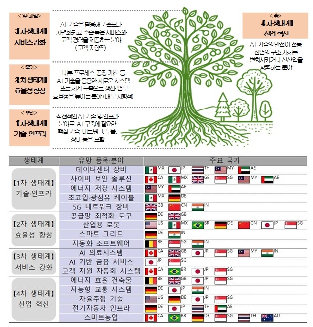 보고서는 AI 생태계를 4개 영역으로 분류하고 국가별 특성에 맞는 진출 기회를 제시했다. 기술·인프라(1차) 생태계에서는 말레이시아와 태국에서 글로벌 빅테크 기업들의 대규모 데이터센터 투자로 냉각시스템, 전력관리장치, 고성능 서버 등 데이터센터 장비 수출이 유망하다고 분석했다. 또한 독일의 재생에너지 확대 정책으로 초고압 케이블과 전선 장비의 수출 기회가 확대될 것으로 전망된다.
