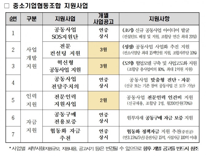 ‘사업개발지원’에는 △신규 공동사업 아이디어 발굴을 상시 지원하는 공동사업SOS지원단(컨설턴트 배정 및 지원) △공동사업의 사업화 계획 추진 관련 컨설팅을 지원하는 전문 컨설팅 지원(컨소시엄당 최대 1500만원 지원) △협업모델 구축 및 사업고도화 등을 지원하는 혁신형 공동사업 지원사업(조합당 직접사업비 최대 1억원 지원)이 있다. 혁신형 공동사업 지원사업 및 전문 컨설팅 지원사업은 3월 중 공고할 예정이다.